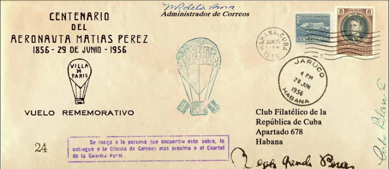 Mas foi preciso aguardar por 1965 para que, em pleno governo revolucionário, Matias Pérez tivesse finalmente uma grande homenagem nacional, com um conjunto de iniciativas que incluiram a emissão de uma série de selos postais dedicados aos "pioneiros do ar", que ele personifica como mais nenhum outro em Cuba. Num dos selos pode ver-se a uma representação gráfica da ascensão de Matias a partir do Campo de Marte, e, no outro, a sua derradeira passagem sobre o Castelo de la Chorrera.